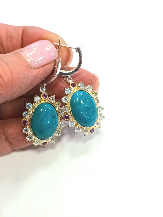 Серьги с натуральной бирюзой (18ct ) и с натуральными голубыми топазами и аметистами
